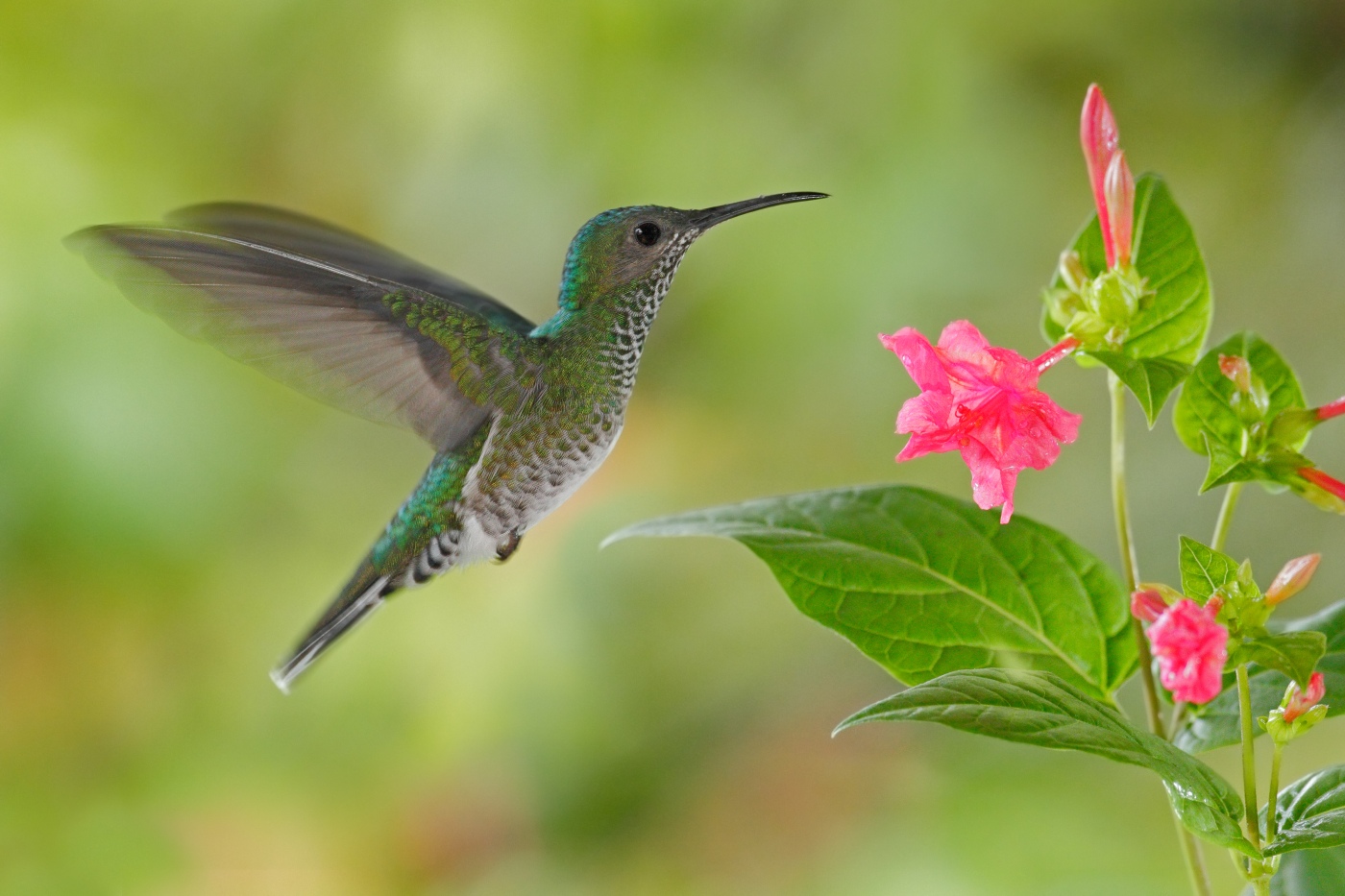Flying hummingbird White-necked Jacobin (female) next pink red flower, Florisuga mellivora, from Rancho Naturalista, Costa RicaFrank Reinecke2017-12-13T13:04:52+01:00